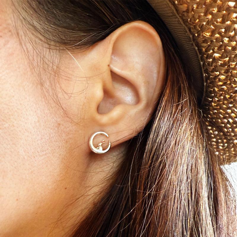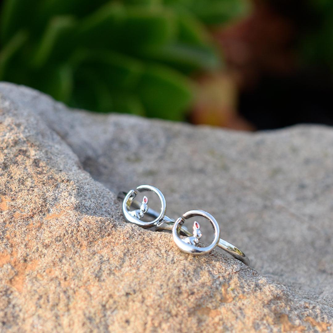 Ez a bájos fülbevaló egy holdon pihenő nyuszit ábrázol, finom kidolgozással. Mi szettben viseljük a hozzá illő gyűrűvel.
